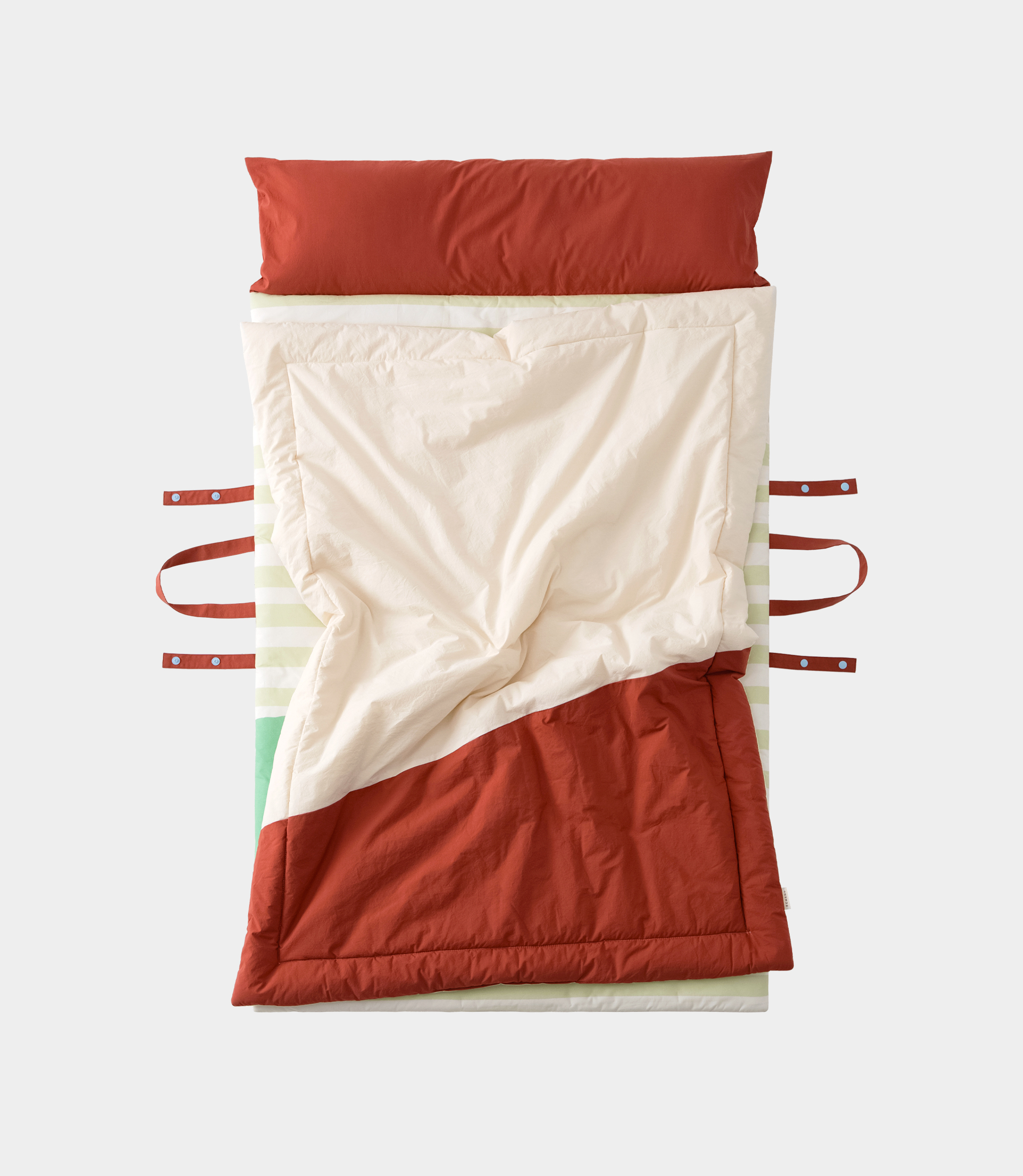 푸른 들판이 연상되는 그린 스트라이프 패턴 위에 에콘드만의 시선으로 그려낸 동물 친구들이 아이들을 기다립니다. 이불을 펴는 순간 펼쳐지는 작은 숲속 풍경은, 아이들에게 낮잠 시간을 ‘숲으로 조용히 산책을 떠나는 즐거운 여정’으로 바꾸어 줍니다.
