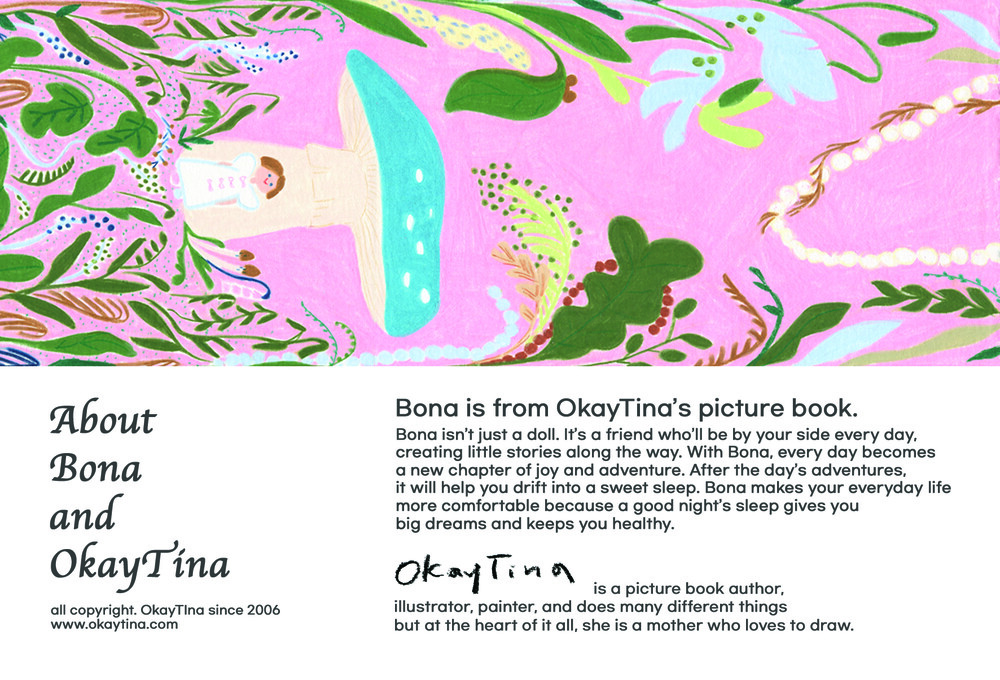 그림책 작가이자 일러스트레이터 오케이티나입니다. 짝짝이 양말, 아이들, 낡은 곰인형,버섯처럼 작은 것들 속에 깃든 강인함과 소중함을 그림으로 표현합니다. 그림책 속에서 나온 ‘보나’는 단순히 인형이 아니라, 누군가의 친구이자 가족으로 특별한 존재가되어주고 싶습니다. 보들보들 털끝마다 따스한 추억이 스며들며, 언제나 아이들의 잠자리를 포근하게 지켜줍니다.
